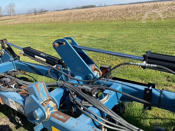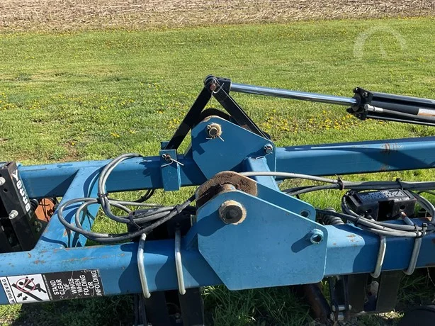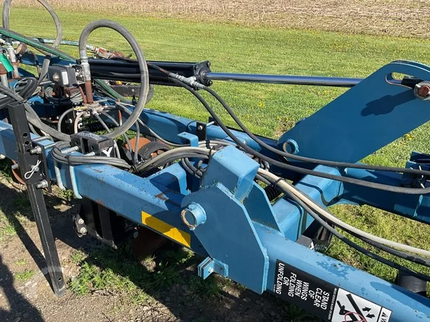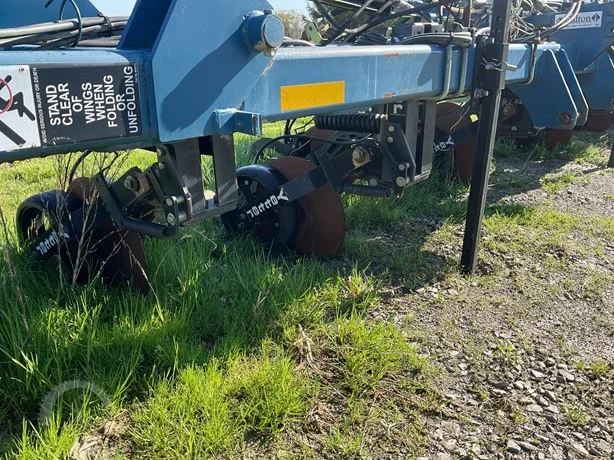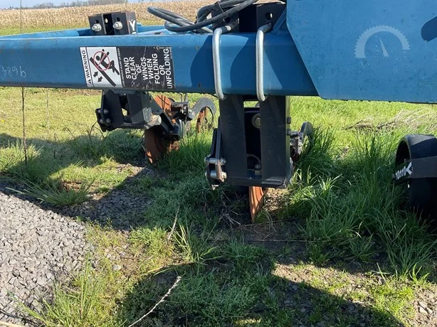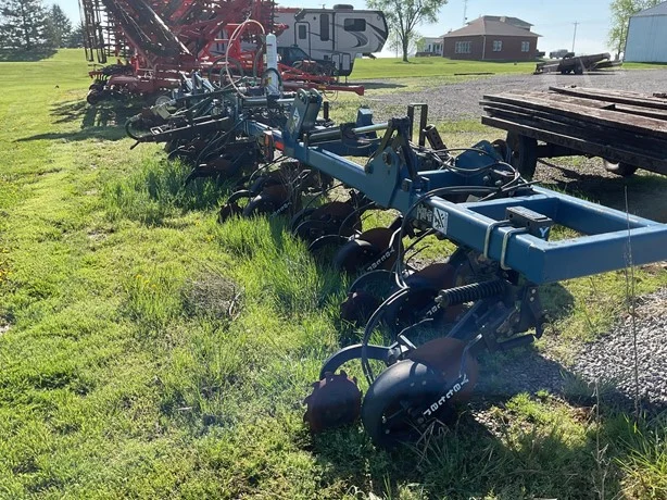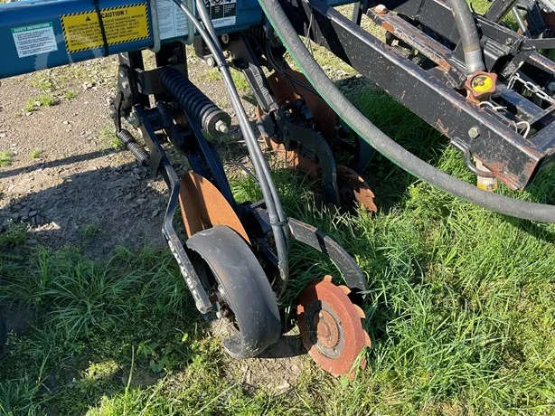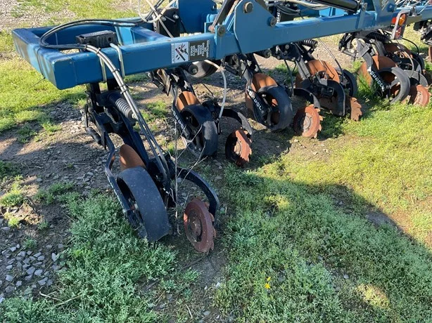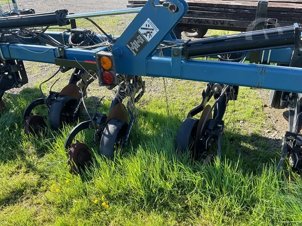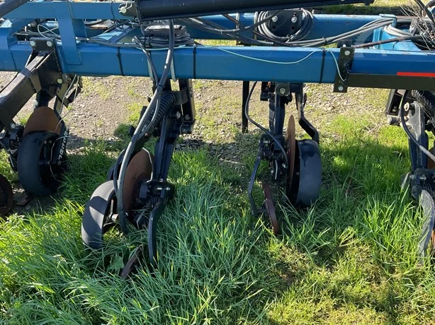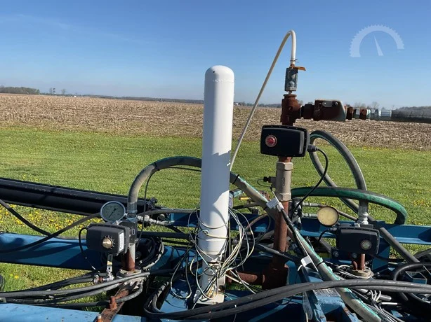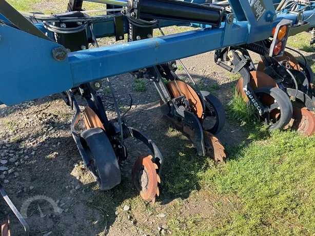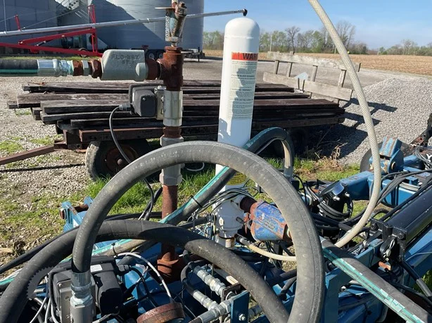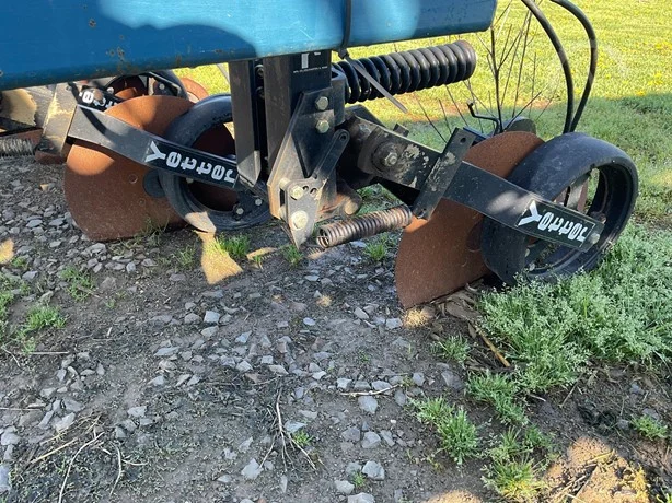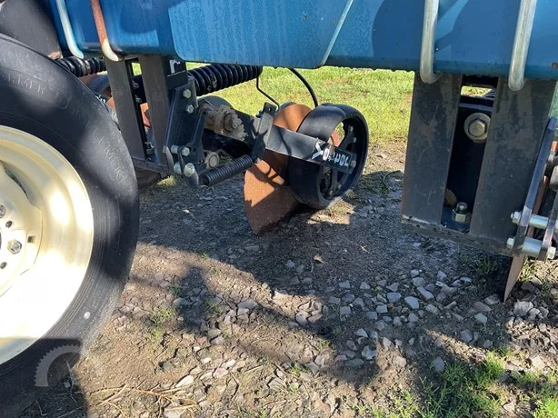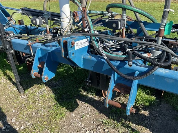 Dalton 15-row anhydrous applicator in great condition, equipped with Yetter disk row units with gauge wheels and closers, cooler, setup for Raven flow controls with K2Value controllers, rear adjustable hitch, lights, and 7.60-15 gauge wheels.